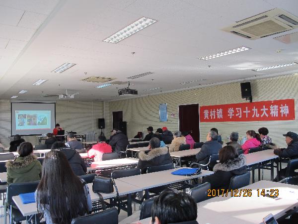 2017年12月26日,黄村镇组织开展了党校流动课堂轮训活动,由区委党校何雪梅教授、李玲教授分别在新兴家园社区和金色漫香郡社区为党员解读十九大精神。此次共有东磁各庄村、西磁各庄村、薄村、侯村、孙村、金色漫香郡、华远和煦里、新凤小区、悦景苑、格林雅苑、浣溪谷11个支部150名党员参加学习。